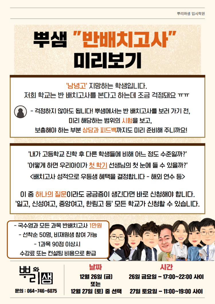 - '뿌샘 반 배치고사' 시행 후 시험 결과를 바탕으로 개별 상담까지 진행하기 때문에, 선착순으로 진행하는 점 양해 부탁드립니다.